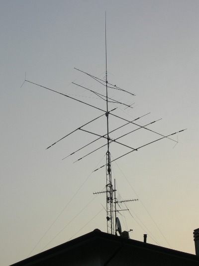 Il mio sistema d'antenne è basato su un traliccio Lanzoni composto da due pezzi di 3 metri (base + cimino), il quale supporta un must di 5,5 metri alloggiato in un rotore Hy-Gain modello Ham IV.